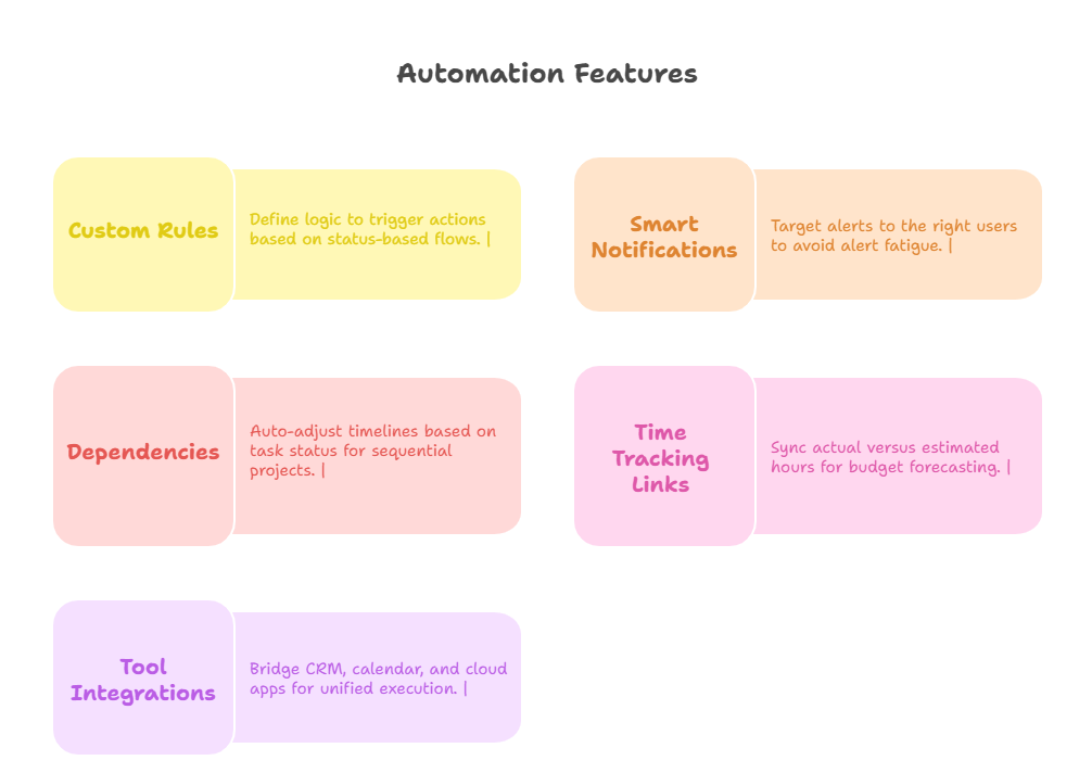 When choosing a project automation platform, it’s not about how many features it has — it’s about how strategically those features drive execution. The first and most critical capability to assess is support for custom rules. These allow you to create condition-based flows tailored to your process: “If status changes to ‘Blocked,’ notify the PM and reschedule dependent tasks.” Without these, you’re stuck with generic templates that fail under pressure.