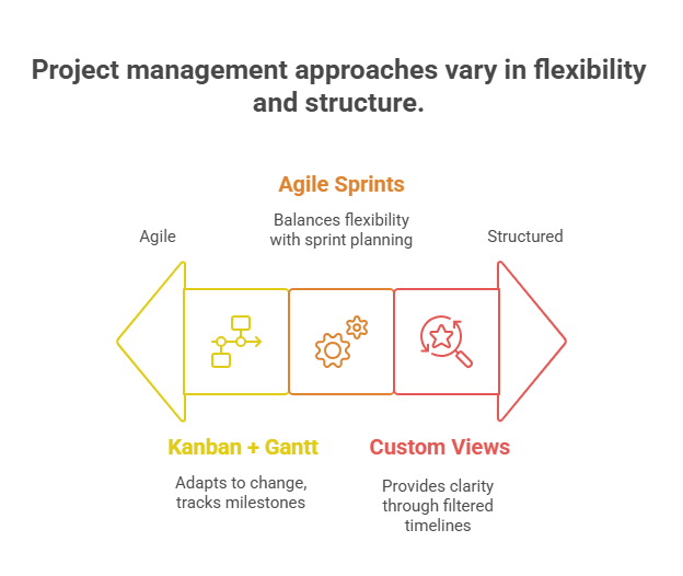 Agile teams no longer have to choose between sprints and timelines. Leading tools now offer Kanban-Gantt hybrids—where you plan sprints using cards and story points, then visualize dependencies and long-term milestones in parallel Gantt views. This dual approach is especially powerful for product launches and iterative development cycles. ClickUp, for example, lets users convert board views into timelines without reassigning tasks. This bridges the gap between iterative execution and strategic visibility, so leaders stay aligned without micromanaging.