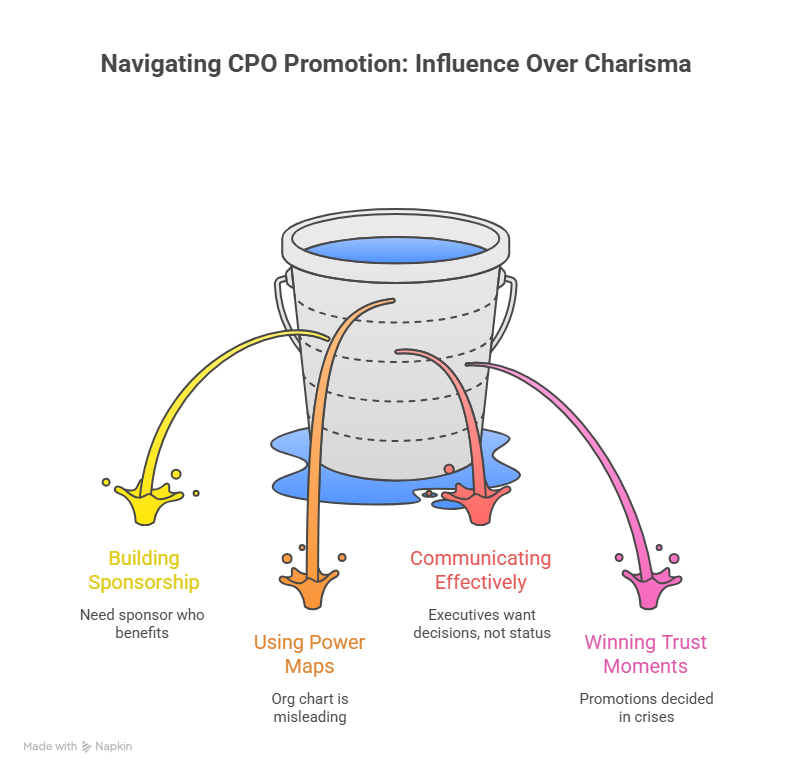 CPO promotion decisions are rarely “who is the best at delivery.” They are “who can be trusted to protect the enterprise from delivery risk while making the right bets.” That requires influence built on clarity, not charisma.