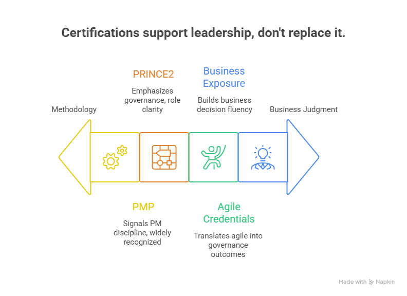 PMP and PRINCE2 can support credibility depending on your environment, while agile credentials can help in transformation-heavy organizations. But at senior levels, certifications only help when paired with proof of enterprise outcomes, PMO system design, and leadership bench-building.