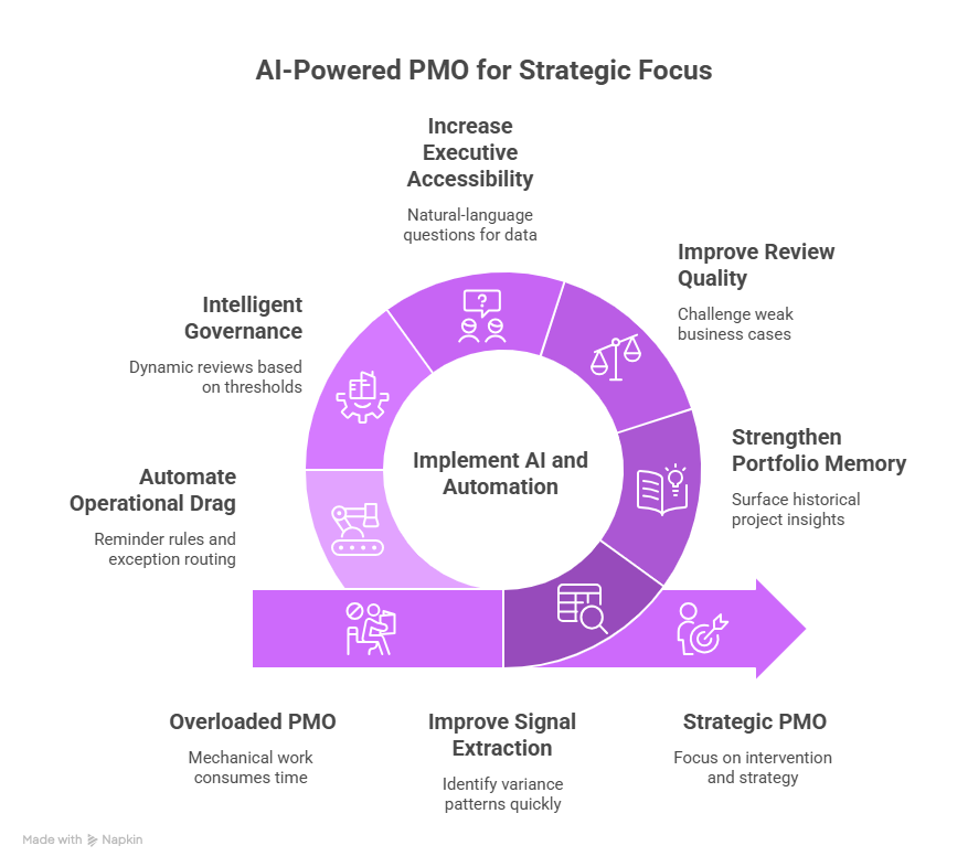 AI will likely reshape PMO workflow in four meaningful layers. First, it will improve signal extraction by identifying variance patterns, emerging delays, missed dependencies, and conflicting forecasts that humans often miss in large portfolios. Second, it will strengthen portfolio memory by surfacing similar historical projects, known delivery risks, and comparable estimate patterns from the knowledge base. Third, it will improve review quality by helping PMOs challenge weak business cases with better evidence. Fourth, it will increase executive accessibility through natural-language questions that pull immediate answers from live portfolio data. These capabilities build naturally on the logic behind knowledge management software, analytics platforms for PMs, machine learning in estimation, and the changing role of the future project manager.