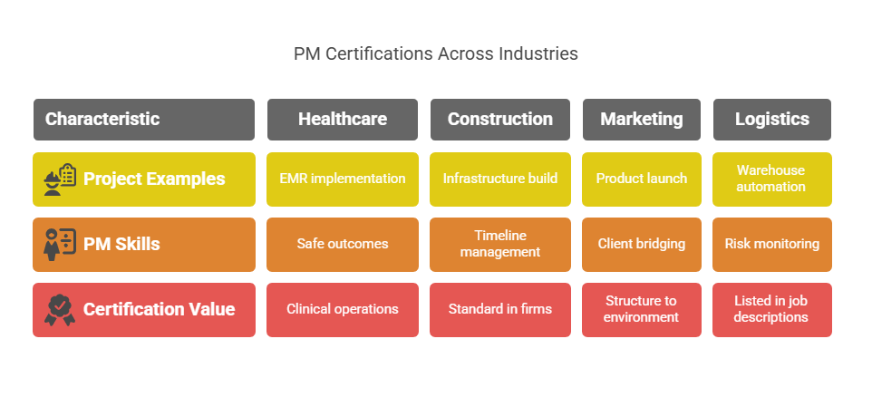 Project management certifications are in high demand across healthcare, construction, education, government, logistics, and nonprofit sectors. In healthcare, PMs manage EMR rollouts and policy compliance. In construction, they oversee large infrastructure builds and subcontractor coordination. In education, they lead grant-funded initiatives and curriculum redesigns. In logistics, certified PMs manage supply chain upgrades and ERP deployments. Employers in these sectors hire certified project managers to ensure accountability, timeline control, and risk mitigation—even when there’s no connection to software or IT systems. Certification proves executional competence across any industry.