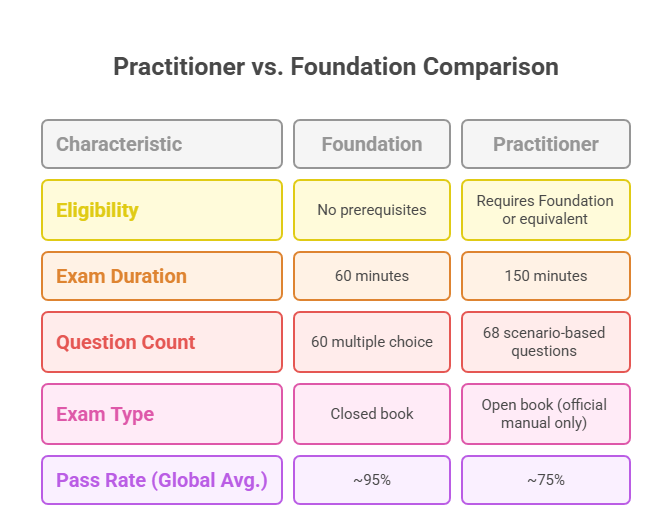 If you're pursuing both certifications back-to-back, plan for 60–70 hours total. Training providers often bundle Foundation + Practitioner in a 5-day intensive format (3 days for Foundation, 2 for Practitioner), but retention rates improve when spaced over 2–3 weeks. Proper pacing improves pass rates and practical understanding.