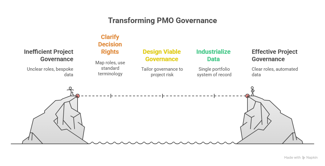 To turn trends into action, PMOs need a pragmatic playbook. Start with clarity of decision rights. Map who decides, who advises, and who is accountable at each step from ideation to closure. Use the terms and patterns from project initiation glossaries and team-building terminology to make sure roles are unambiguous. Then, design minimum viable governance for different project archetypes. Low-risk automation initiatives inspired by AI-enabled PM tools should not carry the same paperwork burden as multi-billion-dollar plants modelled on Tesla-style expansion programmes.