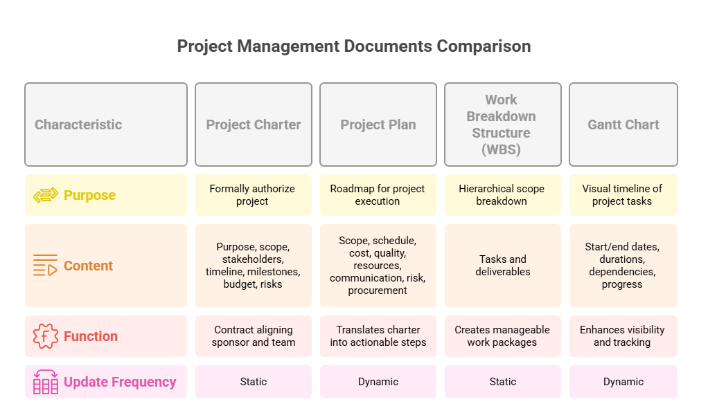 The project charter is a foundational document that formally authorizes the project. It provides a high-level overview of the project, including its purpose, scope, key stakeholders, major milestones, constraints, and high-level risks. The charter serves as a contract between the project sponsor and the project team, ensuring that everyone is aligned on expectations and objectives before execution begins.