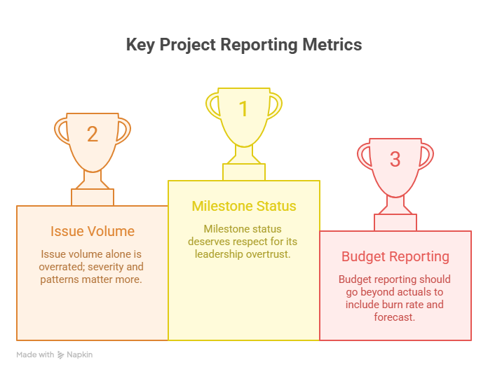 The second mistake is writing reports that dodge discomfort. Some PMs soften language because they want to appear calm, capable, and under control. That instinct is understandable and costly. A project does not become safer because the wording became gentler. Reporting should reduce surprise, not preserve appearances. Leaders can handle bad news far better than late news.