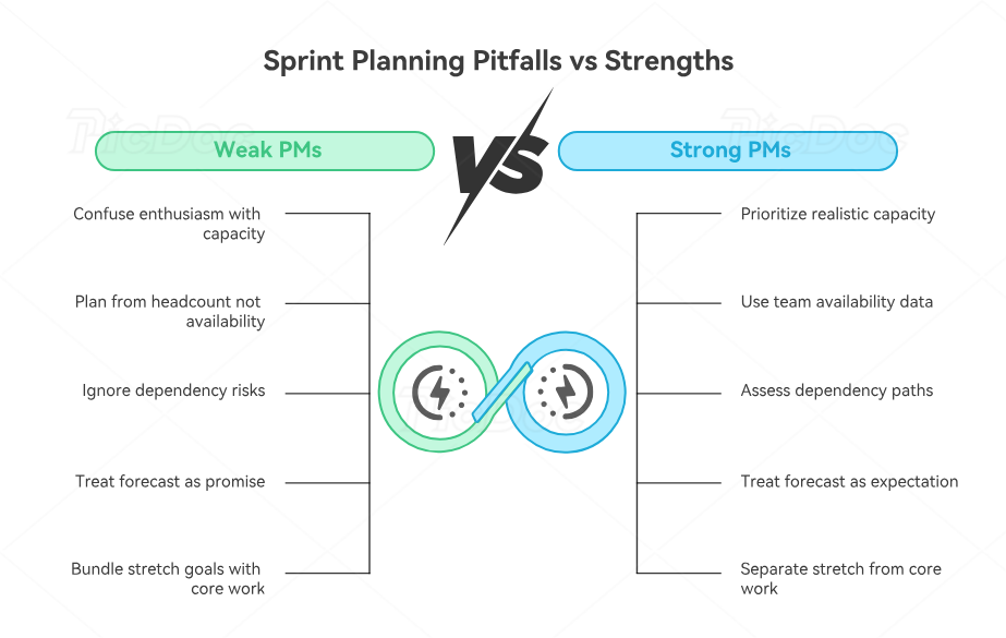 One of the most dangerous sprint planning mistakes is confusing enthusiasm with capacity. Capacity means the team’s realistic available effort for the sprint. It should account for leave, support obligations, operational work, meetings, handoffs, and other interruptions. Teams that ignore those factors create “paper capacity” that looks strong and fails immediately once real life starts pressing on the sprint. PMs who understand capacity thinking usually perform better in resource planning, calendar and scheduling management, mobile coordination tools, and collaboration apps.